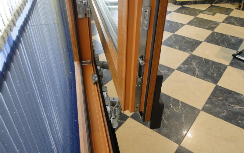 Vista interior, posición abierta, de cerramiento con una hoja paralelas y un fijo lateral en PVC, marca KBE, en color Roble Dorado. Doble cristal de seguridad bajo emisivo + control solar, 6+6-14-4 mm.