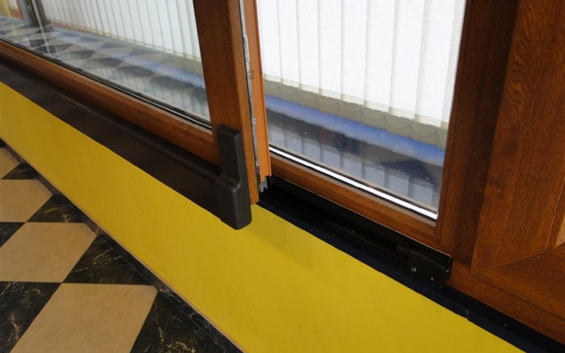 Vista interior, posición cerrada, de cerramiento con una hoja paralelas y un fijo lateral en PVC, marca KBE, en color Roble Dorado. Doble cristal de seguridad bajo emisivo + control solar, 6+6-14-4 mm.